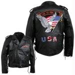 Features zip-out polyester lining gunmetal zipper and buckle with black snaps large eagle patch on the back multiple small patches belted waist leather laces shirt collar that snaps down slash pockets and snap epaulets on the shoulder. Embroidered patches are included and already sewn in place!